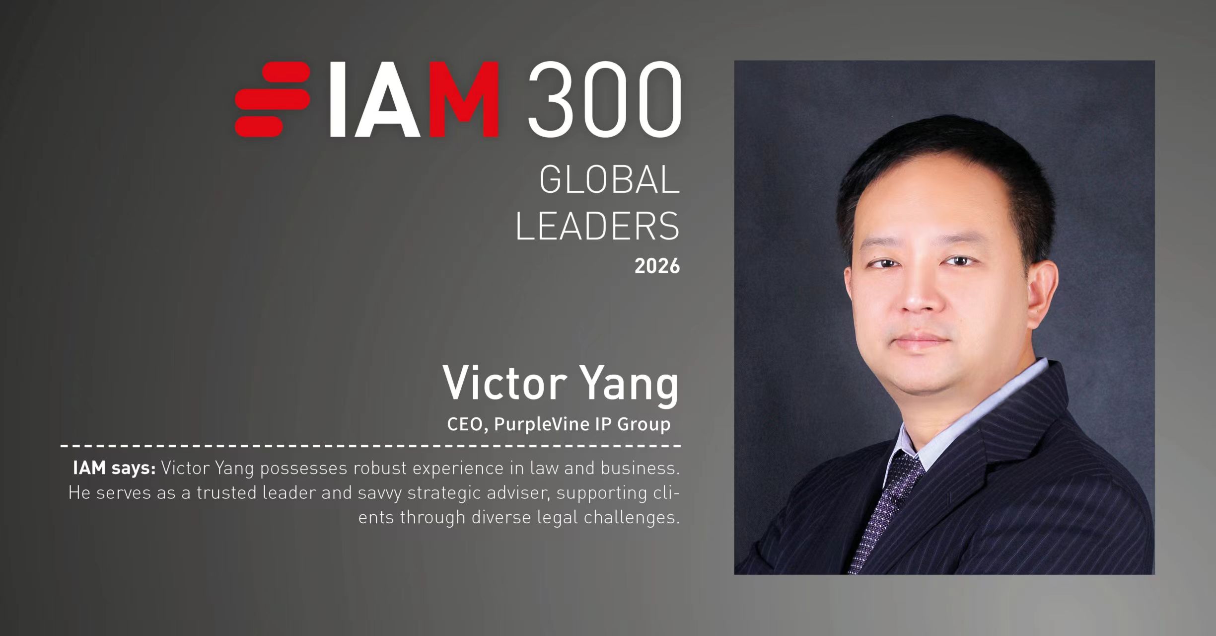 Shenzhen, 20 November 2025 - Victor Yang, Chief Executive Officer of PurpleVine IP, has been named to the IAM 300 Global Leaders 2026 list, a prestigious recognition that honors individuals with exceptional influence in global IP strategy, operations, and commercialization. Published annually by leading international IP publication IAM, the ranking highlights top practitioners who shape and drive the future of the global IP landscape.